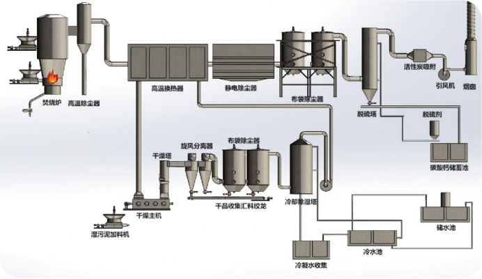 焚烧炉流程采用天燃气点火,生物质作为辅助燃料加热恒温850度,焚烧4~6秒,焚烧处置70%含固量污泥,焚烧结晶后的灰渣高温除尘分离(分离后的850度的高温灰渣通过预冷装置冷灰装置、冷却到80度以下,再输送到灰渣储存池)。焚烧炉脱销采用SNCR进行脱销,然后通过高温换热器把850°C的烟气换热成250℃,250”C的烟气再通过板式换热器换成130℃烟气进入布袋除尘器,然后经过脱硫装置,脱硫后的烟气经过活性炭吸附装置后进入烟囱排放。