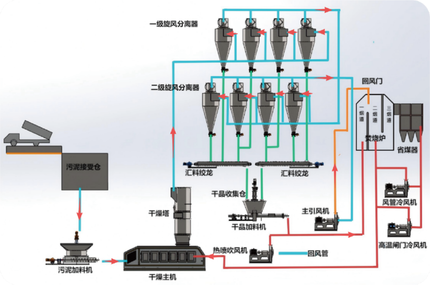 由污泥专用车辆将湿污泥卸到污泥储料仓内,由储料仓底部的注塞泵将湿污泥输送到干化机旁螺旋计量仓,计量仓计量后转卸到污泥加料仓,通过下设螺旋绞龙连续定量地送入干化机本体。干化烟气从焚烧炉顶部抽出高温烟气,烟进入WZX1160旋转沸腾干燥机本体,湿污泥与高温烟气直接接触进行传热传质,被迅速干化后的污泥颗粒由气流带出干化室进入干化塔、干化分级后进入旋风分离器气固分离、然后采用关风机把干污泥直接卸到干泥加料仓,由下设螺旋绞龙输送至垃圾焚烧炉进行焚烧,干化后烟气返回二烟道。系统设计为24小时连续运行。